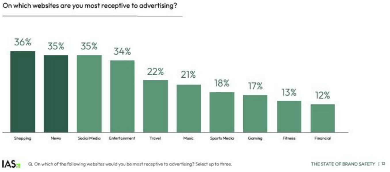 Como mencionei, o usuário não acessa uma plataforma por causa dos anúncios; ele entra apesar dos anúncios. A imagem abaixo ilustra bem esse cenário, mostrando a receptividade dos usuários à publicidade dependendo do tipo de website. Como podemos ver, 36% dos usuários em ambientes de compra se dizem receptivos, enquanto em ambientes financeiros vemos o menor índice, apenas 12% dos usuários.