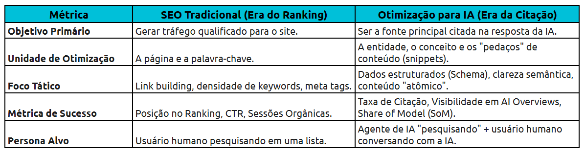 O objetivo é ser a "resposta definitiva" que a IA escolhe para apresentar em formatos como AI Overviews e featured snippets.